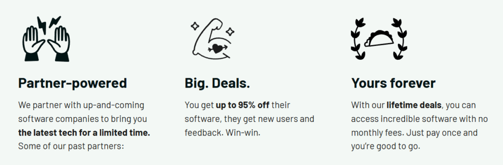 • Exclusive Deals: Lifetime offers you won’t find anywhere else through partnerships with startups and emerging SaaS companies