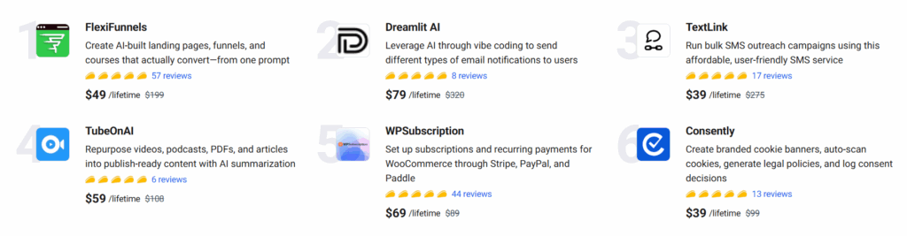 - Price Range: Typically $49 – $499+ for lifetime deals. Higher tiers for more users/features command higher prices.